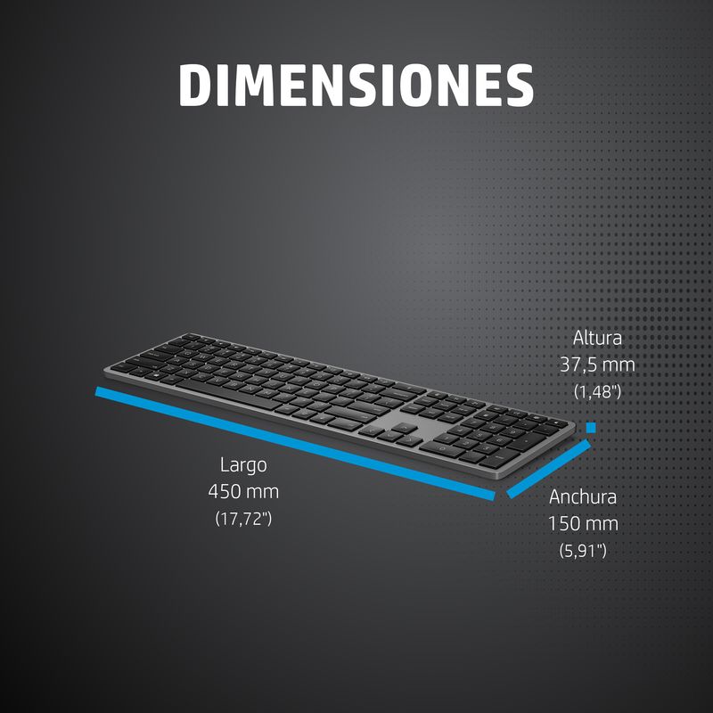 El HP 975 USB+BT Dual-Mode Wireless Keyboard de HEWLETT PACKARD presenta un formato de teclado completo (100%) en un sofisticado color negro. Su interfaz dual Bluetooth y USB permite una conexión flexible y fiable. Disfruta de una experiencia de escritura cómoda gracias a su retroiluminación integrada y su diseño pensado para el uso prolongado. Este teclado cuenta con un teclado numérico y no incluye dispositivo apuntador. Su batería recargable, con carga vía USB, garantiza autonomía. Las dimensiones del teclado son 117,1 x 429,7 x 12,2 mm y su peso es de 649 g. El paquete incluye un nanorreceptor.
