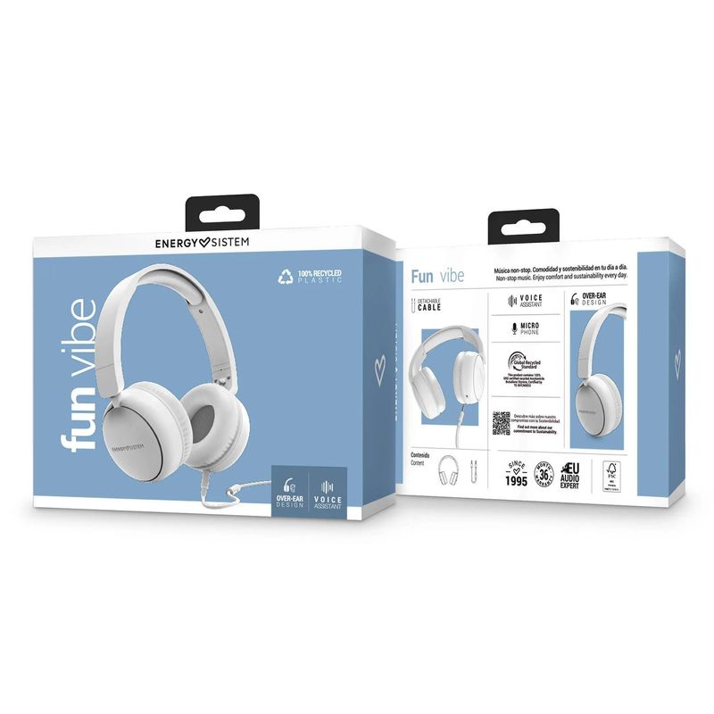 Disfruta de un sonido envolvente con los AURICULARES ENERGY SISTEM FUNVIBE SNOW, ideales para tu uso diario. Su diseño ligero (151g), plegable y con diadema ajustable garantiza comodidad y portabilidad máximas, adaptándose a ti. Conéctalos fácilmente a cualquier dispositivo gracias a su cable extraíble de 1,5m y conector universal de 3,5mm, y mantén tus conversaciones claras con el micrófono integrado.