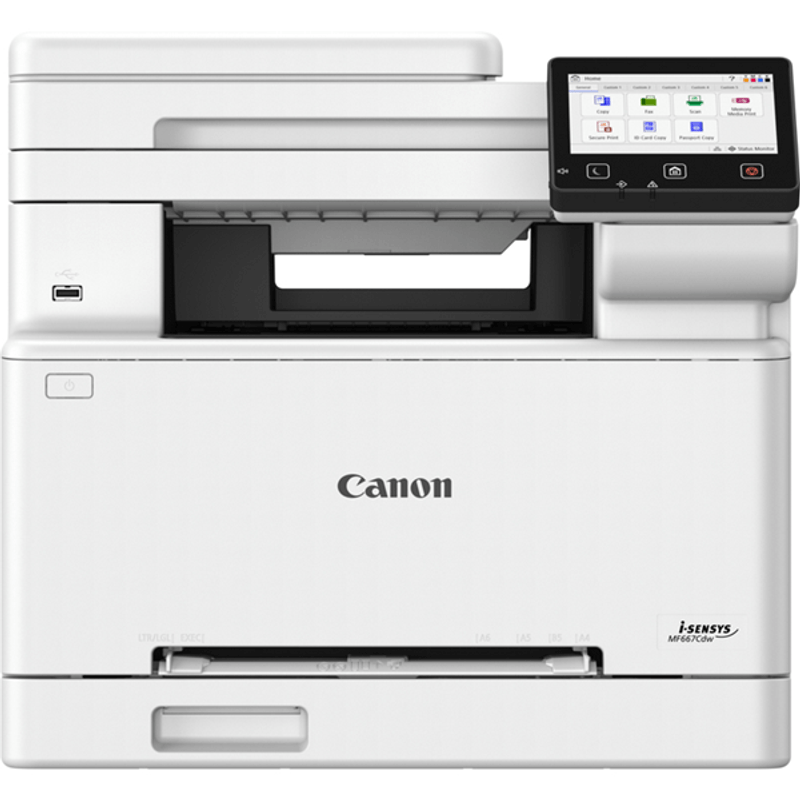 La impresora CANON i-SENSYS MF667Cdw es una solución multifunción láser a color, con resolución máxima de impresión de 1200 x 1200 DPI y una velocidad de 25 ppm. Ofrece impresión, escaneo a color (resolución óptica 600 x 600 DPI) y fax a color, con funciones dúplex automáticas para imprimir, copiar y enviar faxes. Soporta impresión móvil con Apple AirPrint y Mopria Print Service, además de conectividad Ethernet y WiFi. Su capacidad de entrada es de 250 hojas en la bandeja principal y 1 hoja en la bandeja multifunción, con una capacidad de salida de 100 hojas. El alimentador automático de documentos (ADF) tiene capacidad para 50 hojas. Incorpora una pantalla LCD táctil a color y procesador de 1200 MHz con 1 GB de memoria interna. El ciclo de trabajo recomendado es de 250 a 2500 páginas al mes, con un máximo de 30000 páginas. Sus dimensiones son 425 mm de ancho, 461 mm de profundidad y 397 mm de altura, con un peso de 20.8 kg. Compatible con Windows, macOS y Windows Server.