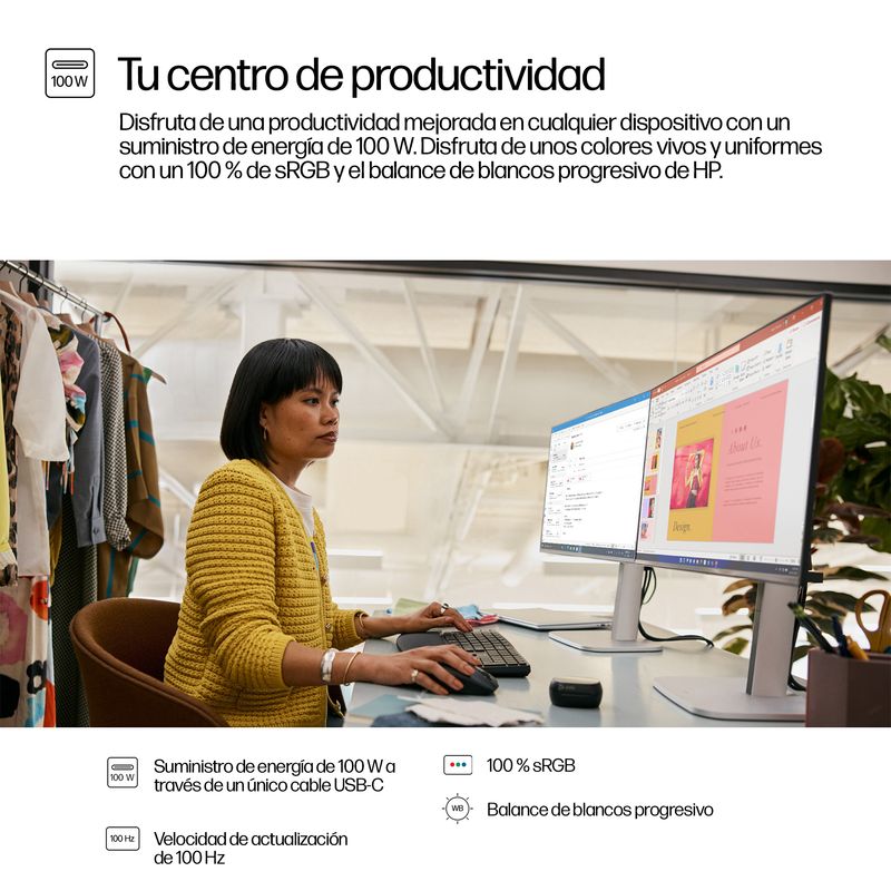 Disfruta de una experiencia visual superior con el monitor HEWLETT PACKARD 524pu de 23.8" Full HD IPS, que te ofrece imágenes nítidas y colores vibrantes. Su práctica conectividad USB-C con Power Delivery de 100W y hub USB integrado simplifica tu escritorio, mientras que sus tecnologías de cuidado visual y ajustes ergonómicos aseguran tu confort.