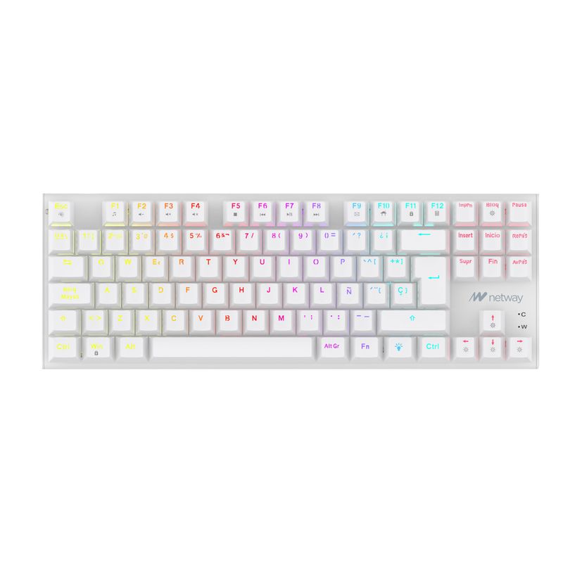 El Teclado Mecánico NETWAY Gaming XK740TKL, modelo APP-NW3702, destaca por su diseño TKL (Tenkeyless) en un elegante acabado blanco y su interfaz USB-C con adaptador USB-A incluido. Incorpora interruptores mecánicos para una respuesta táctil precisa, ideales para el juego y la escritura intensiva. Su distribución QWERTY cuenta con 88 teclas, incluyendo 12 teclas multimedia y 25 teclas con sistema anti-ghosting, asegurando la máxima fiabilidad en cada pulsación. La retroiluminación LED RGB es totalmente personalizable para crear el ambiente perfecto. Con teclas multimedia y teclas de Windows, este teclado NETWAY es compatible con sistemas operativos Windows y Mac. Sus dimensiones son 352 x 124 x 35 mm y tiene un peso de 540 g, ofreciendo un diseño compacto y ligero. La vida útil de sus teclas es de 50 millones de pulsaciones, garantizando durabilidad.