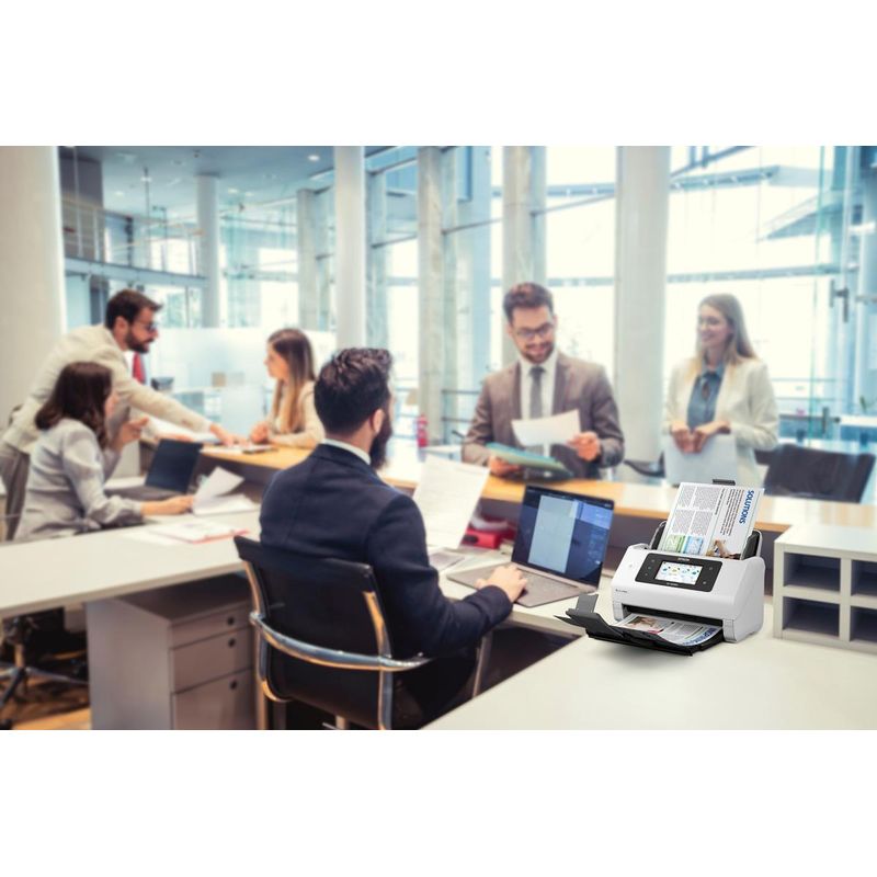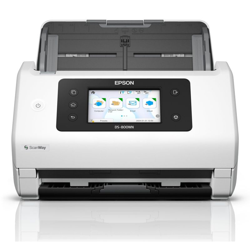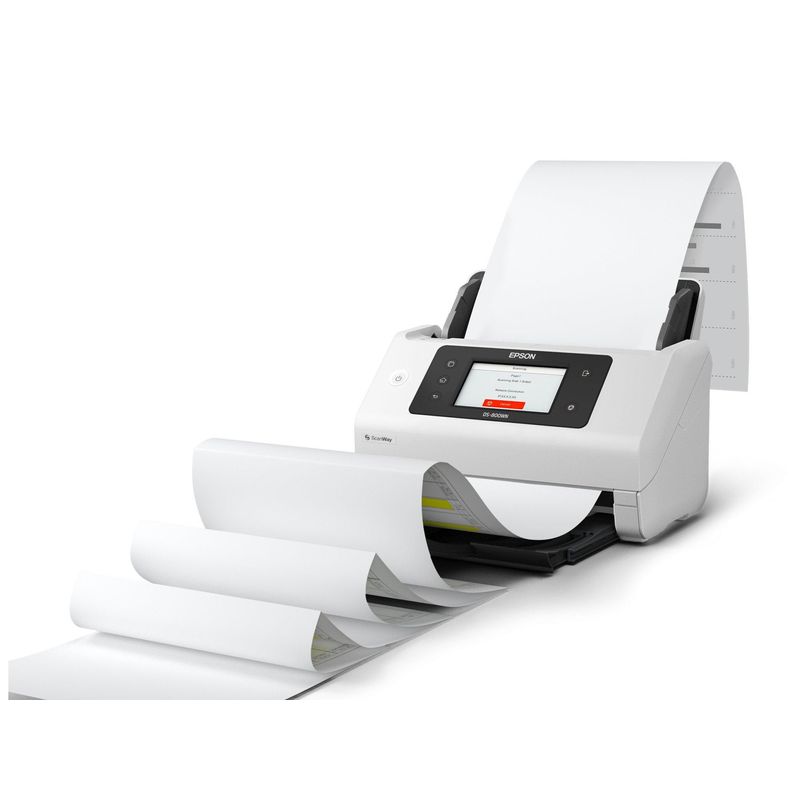 El escáner Epson WorkForce DS-800WN es una solución robusta para la digitalización profesional. Ofrece una resolución óptica de hasta 600 x 600 DPI y puede escanear documentos de hasta 215,9 x 6096 mm, cubriendo una amplia gama de formatos, incluyendo tarjetas de visita, sobres y tarjetas de plástico, así como tamaños A3, A4, A5, A6, B4, B5 y B6. Su alimentador automático de documentos (ADF) tiene una capacidad de 100 hojas, permitiendo un escaneo dúplex de hasta 100 ipm (imágenes por minuto) a color y en blanco y negro, con una velocidad de escaneo simple de 50 ppm. Incluye software avanzado como Epson Scan 2 y Document Capture Pro, con funciones como OCR integrado y detección de página en blanco para optimizar flujos de trabajo. La conectividad Wi-Fi y Ethernet (compatible con Wi-Fi 4/802.11n y Wi-Fi 5/802.11ac) facilita el escaneo directo a la nube, correo electrónico o carpetas de red, además de contar con un puerto USB 3.2 Gen 1. Su ciclo de trabajo diario máximo es de 8000 páginas. Las dimensiones del equipo son 296 mm de ancho, 212 mm de profundidad y 217 mm de altura, con un peso de 3,7 kg. Compatible con sistemas operativos Windows, mac y Linux. El consumo energético es de 18 W.