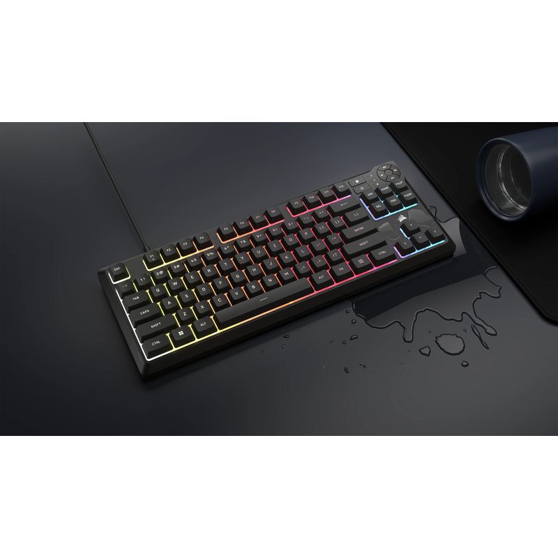 El TECLADO CORSAIR K55 CORE TKL RGB destaca por su formato Tenkeyless (TKL), optimizando el espacio y ofreciendo 88 teclas en un diseño compacto. Su conectividad es alámbrica mediante USB, compatible con Windows y macOS. Los interruptores de membrana proporcionan una pulsación cómoda, mientras que la tecnología Rollover de 12 teclas asegura la precisión en cada comando. La retroiluminación LED RGB es personalizable y cuenta con protección contra salpicaduras de hasta 300 ml. Incluye teclas multimedia y función WinLock. El diseño en color negro con acabado monocromo se complementa con una altura de teclado ajustable. El peso del teclado es de 843g.