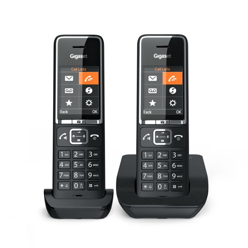 El Gigaset Confort 550 Duo Iberia es un teléfono analógico inalámbrico con pantalla TFT a color de 2.2 pulgadas y resolución de 220 x 176 píxeles, que ofrece una clara visualización de hasta 200 contactos en su agenda. Incluye altavoz, envío y recepción de SMS, y la función Babyphone. Su modo ECO optimiza el consumo de energía, y es compatible con GAP. El diseño es en color negro, pensado para escritorio, con botones retroiluminados y bloqueo de teclado. Cuenta con identificador de llamadas, remarcado, registro de hasta 20 llamadas entrantes y salientes, y bloqueo de llamadas. La gestión de llamadas incluye llamada en espera y tiempo de llamada. Su administración es sencilla con tecla de navegación y alarmas, además de control de volumen. Personaliza tonos, temas y fondos de pantalla. Las dimensiones de los auriculares son 52 x 26 x 161 mm con un peso de 115g. La base mide 123 x 99 x 43 mm y pesa 158g. Utiliza baterías NiMH AAA con 320 horas en reposo y 17 horas de conversación. El embalaje incluye dos auriculares, estación base y manual de usuario.