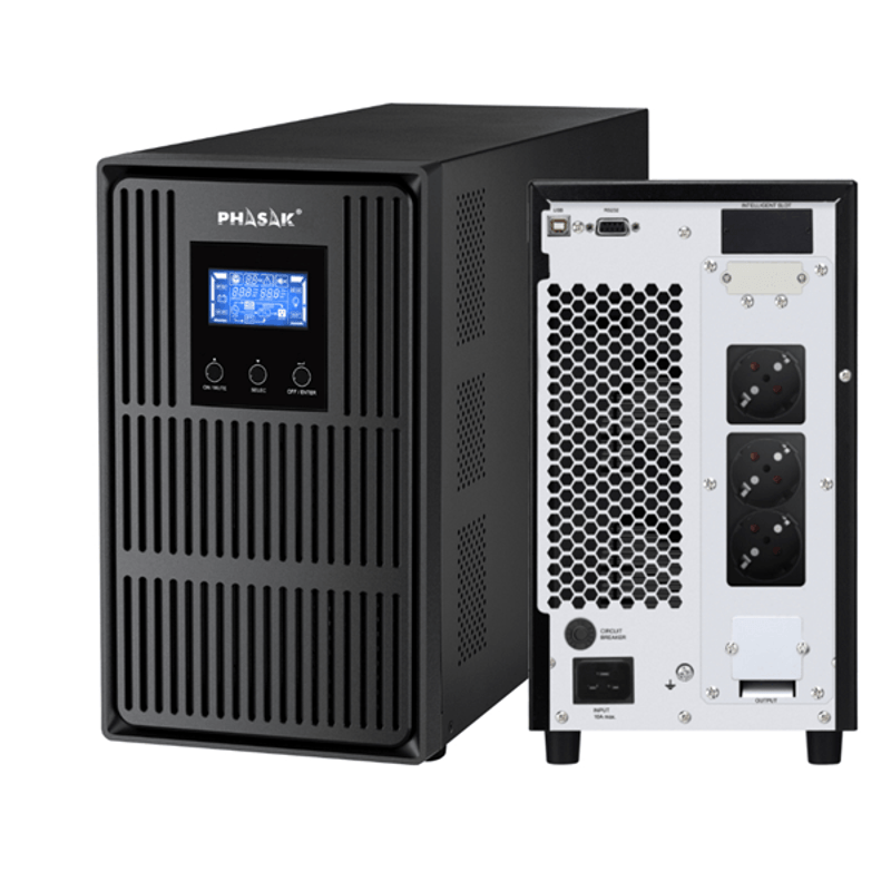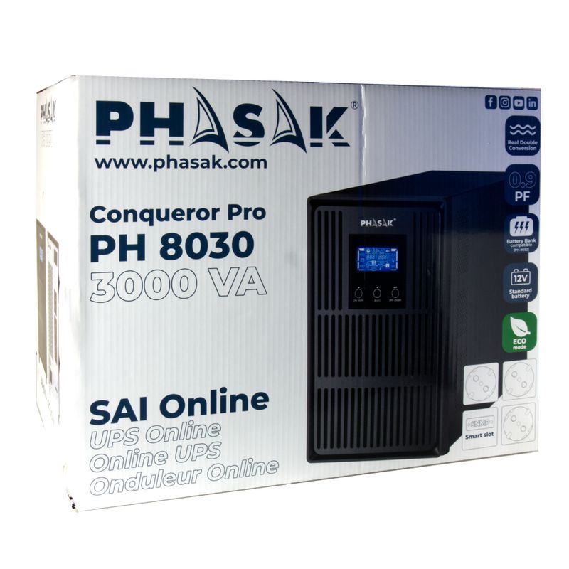 El SAI Phasak Conqueror Pro Online PH 8030 es la solución ideal para proteger tus equipos críticos. Su topología de doble conversión garantiza energía pura y estable (onda sinusoidal), evitando daños y asegurando un rendimiento óptimo. Con 3000 VA / 2700 W, ofrece una gran capacidad y hasta 15 minutos de autonomía para gestionar cualquier imprevisto. Además, cuenta con 3 salidas AC y múltiples puertos para una conectividad y control total.