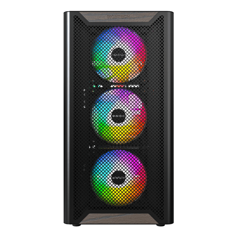 La caja MONTECH XR Wood RGB Negro combina estilo y rendimiento. Su frontal de madera de nogal y la iluminación RGB multicolor personalizan tu setup. Incluye 3 ventiladores frontales y 1 trasero preinstalados para una refrigeración óptima que protege tus componentes, junto a un filtro anti-polvo. Ofrece gran compatibilidad para placas ATX y tarjetas gráficas de gran tamaño, y puertos USB 3.2 Gen 2 Tipo C para una conectividad moderna.